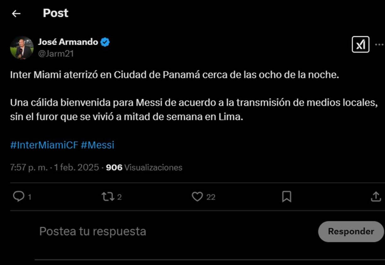 21 / 24José Armando Rodríguez, periodista que cubre la información del Inter Miami, asegura que en Panamá no enloquecieron por el astro argentino. “Una cálidad bienvenida para Messi, sin el furor que se vivió a mitad de semana en Lima (Perú)”.