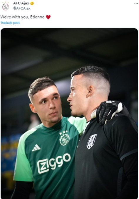 Así se vivió el duro momento durante el partido entre el Ajax y el RKC Waalwijk. El arquero Vaessen se desplomó y tuvo que ser atendido ante el fuerte golpe que recibió.