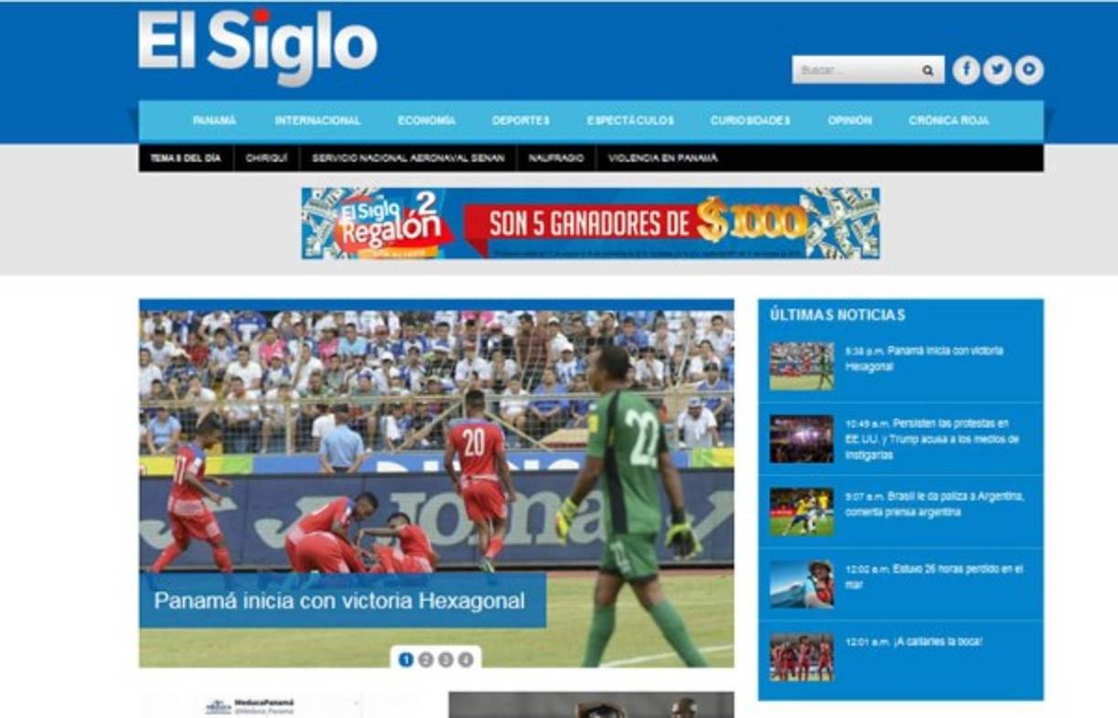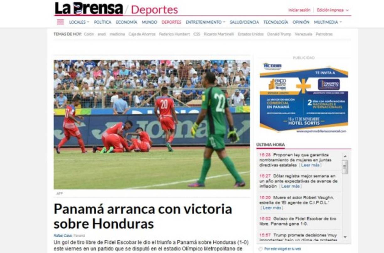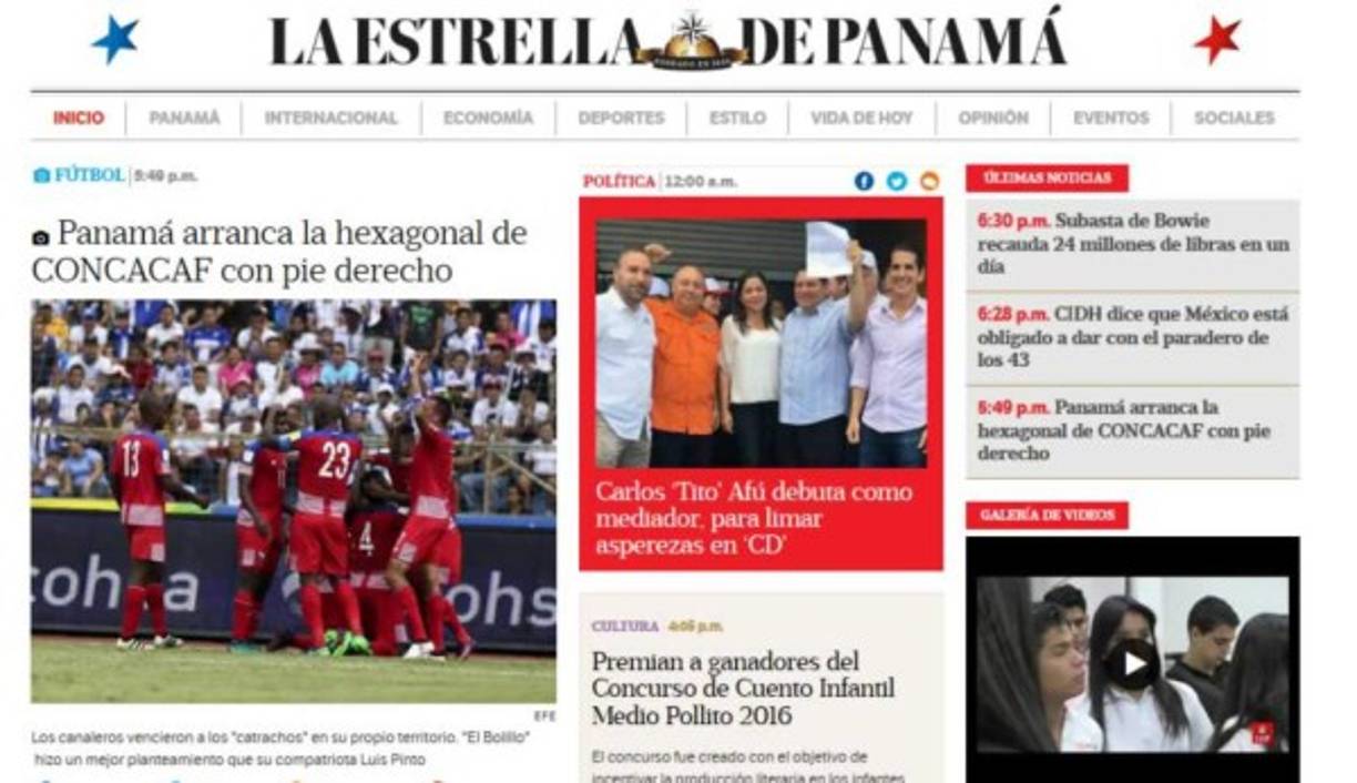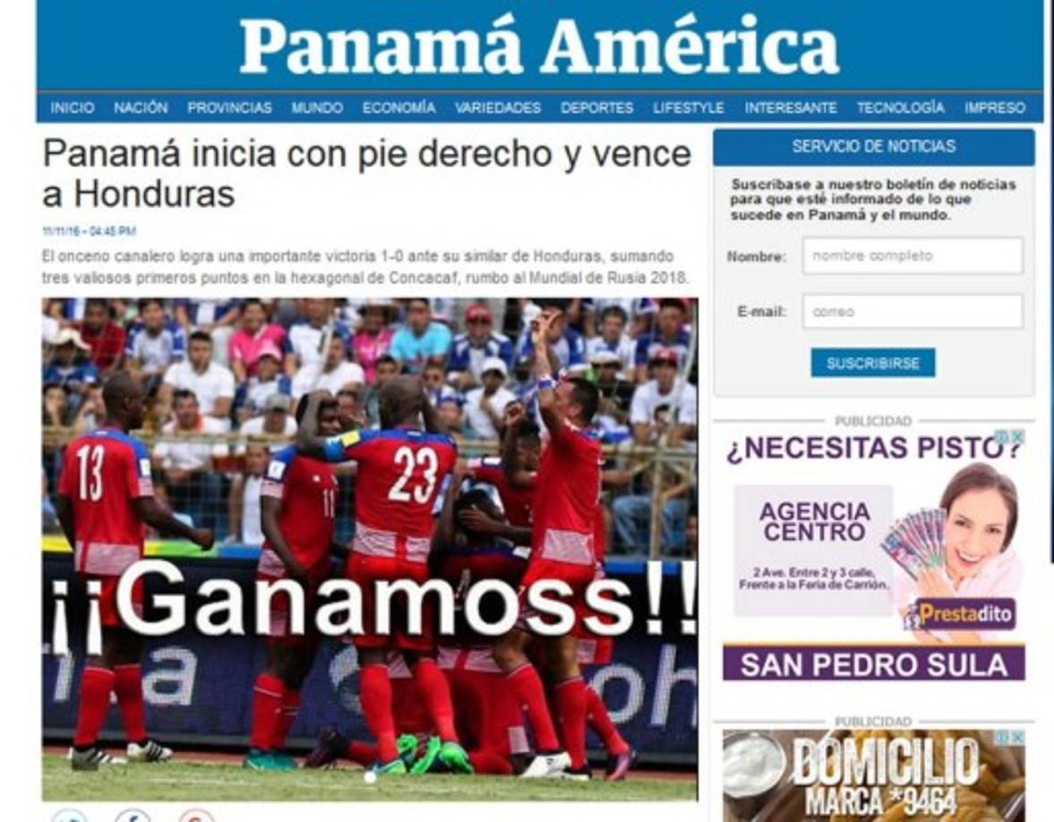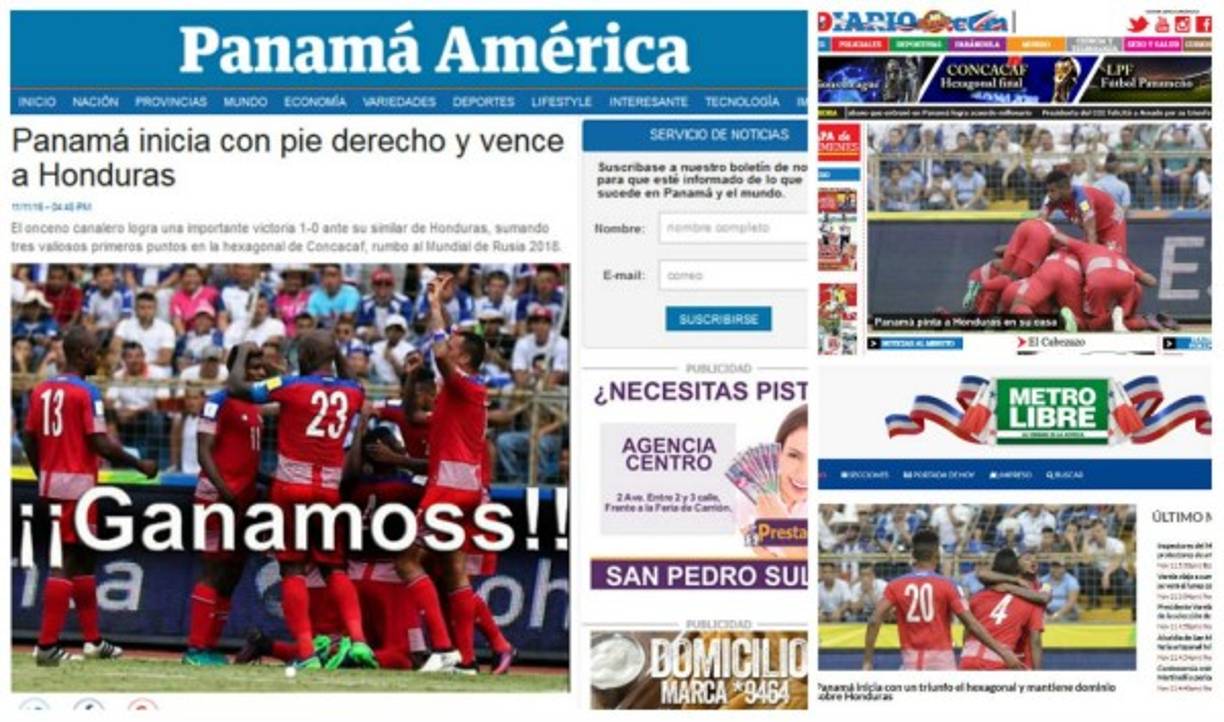 6 / 8Panamá América: 'Panamá inicia con pie derecho y vence a Honduras. El onceno canalero logra una importante victoria 1-0 ante su similar de Honduras, sumando tres valiosos primeros puntos en la hexagonal de Concacaf, rumbo al Mundial de Rusia 2018'. -