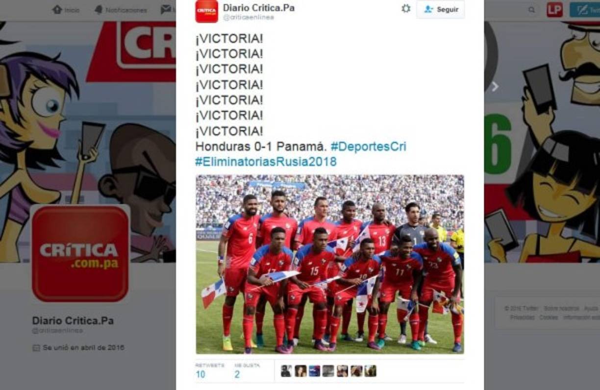 8 / 8Diario Crítica destacó en sus redes sociales el triunfo de Panamá sobre Honduras.