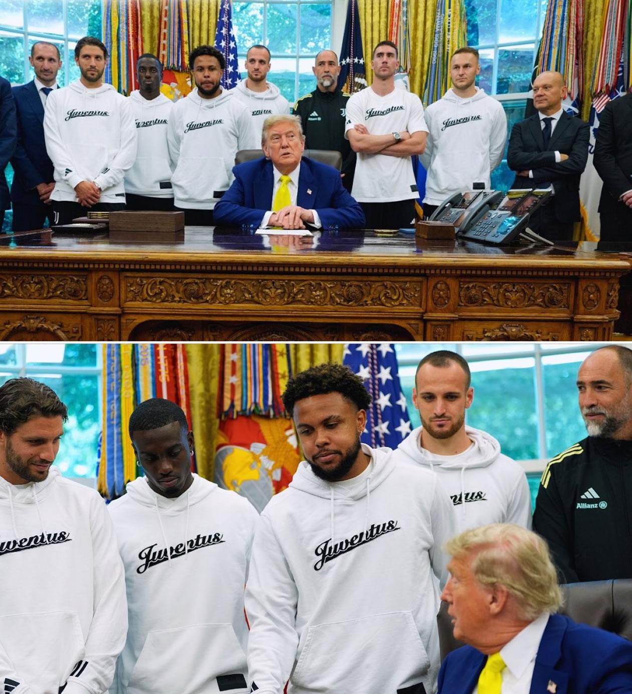 La Juventus envió a la Casa Blanca a una delegación formada por el dueño John Elkann, el consejero delegado Maurizio Scanavino, el director general Damien Comolli, el directivo Giorgio Chiellini y los futbolistas Weston McKennie, Weah, Manuel Locatelli, Federico Gatti, Dusan Vlahovic y Teun Koopmeiners, además del técnico Igor Tudor.