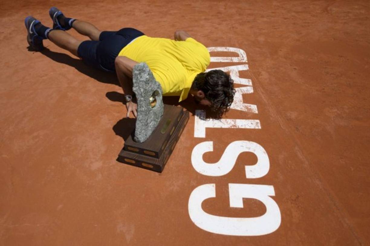5 / 6TENIS. Feliciano, rey sobre la arcilla de Gstaad. El jugador español Feliciano López besa un cartel al lado de su trofeo después de ganar el juego final contra el holandés Robin Haase durante el Abierto de Suiza Gstaad. -