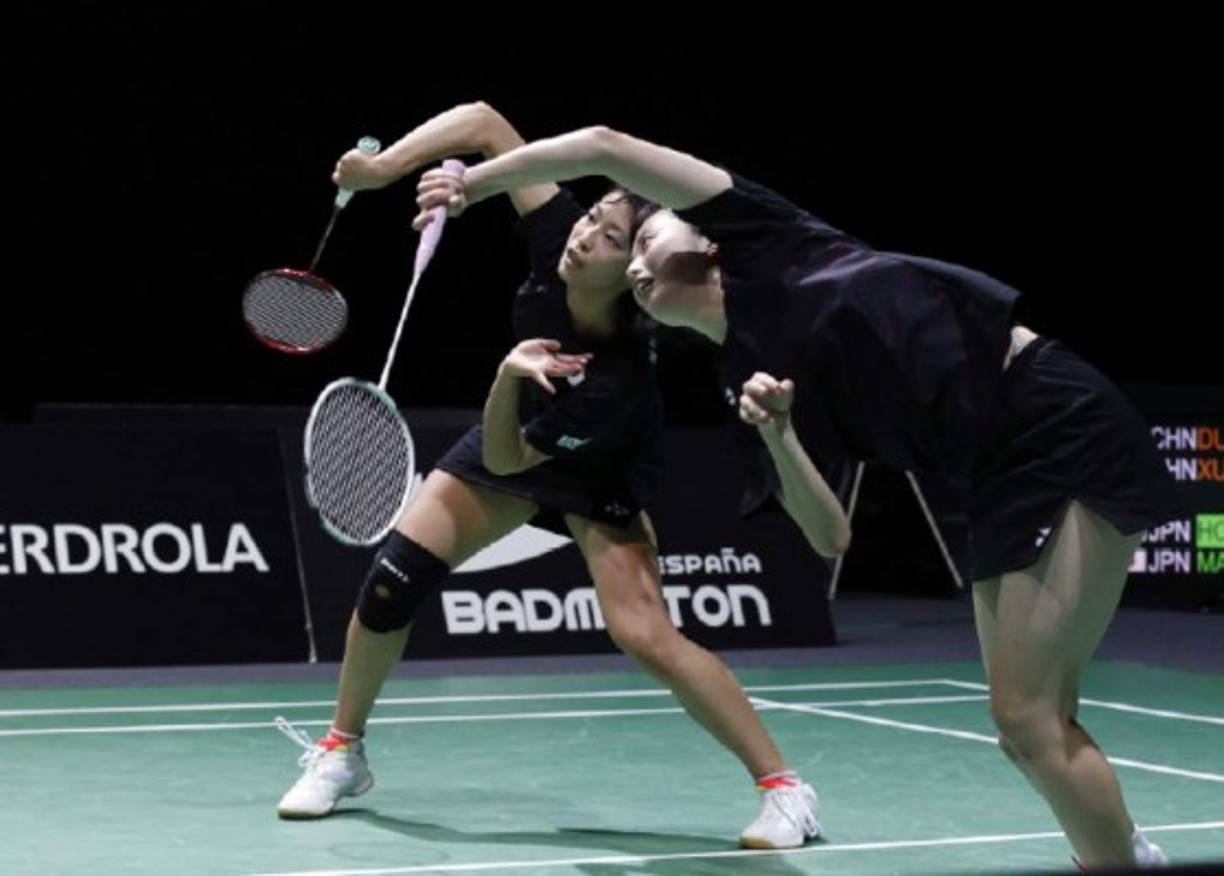 4 / 6BÁDMINTON. Bien sincronizadas. Las jugadoras japonesas Hobara Sayaka (derecha) y Matsuyama Nami durante la final de dobles femenino donde quedaron campeonas, del Campeonato Mundial de Badminton júnior disputado en Bilbao, España. -