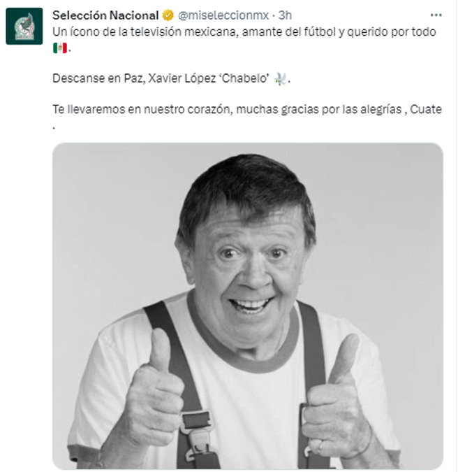 5 / 19“Un ícono de la televisión mexicana, amante del fútbol. Descanse en Paz, Xavier López ‘Chabelo’ . Te llevaremos en nuestro corazón, muchas gracias por las alegrías , Cuate “, expresó la cuenta de la Selección de México.