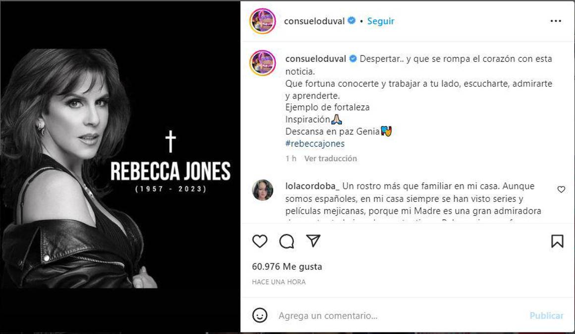 6 / 12Arlette Pacheco también “lamentó” la noticia que tiene en luto al mundo del entretenimiento de habla hispana. “Una enorme tristeza me embarga. Se nos fue la espléndida actriz y mejor amiga Rebecca Jones. A sus familiares les envío un fuerte abrazo”, dijo en Instagram.