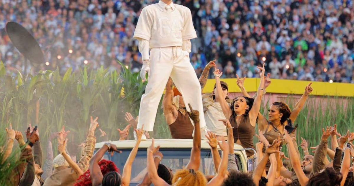 “Bienvenidos al espectáculo del medio tiempo del Súper Tazón”, decía, en español, la pantalla del estadio de los San Francisco 49ers a la mitad de la espesa final de la NFL que enfrentó a los Seahawks contra los Patriots. Sobre la hierba, el cantante llegó de punta en blanco, con un balón de fútbol americano que retomó al final de la actuación, cuando, con el fondo de su himno DtMF, exclamó “Seguimos aquí” y marcó un touchdown. Estaba rodeado de un cuerpo de baile que portaba las banderas de todos los países del continente americano, cuyos nombres recitó el cantante, que se reservó para él la de su isla, Puerto Rico.