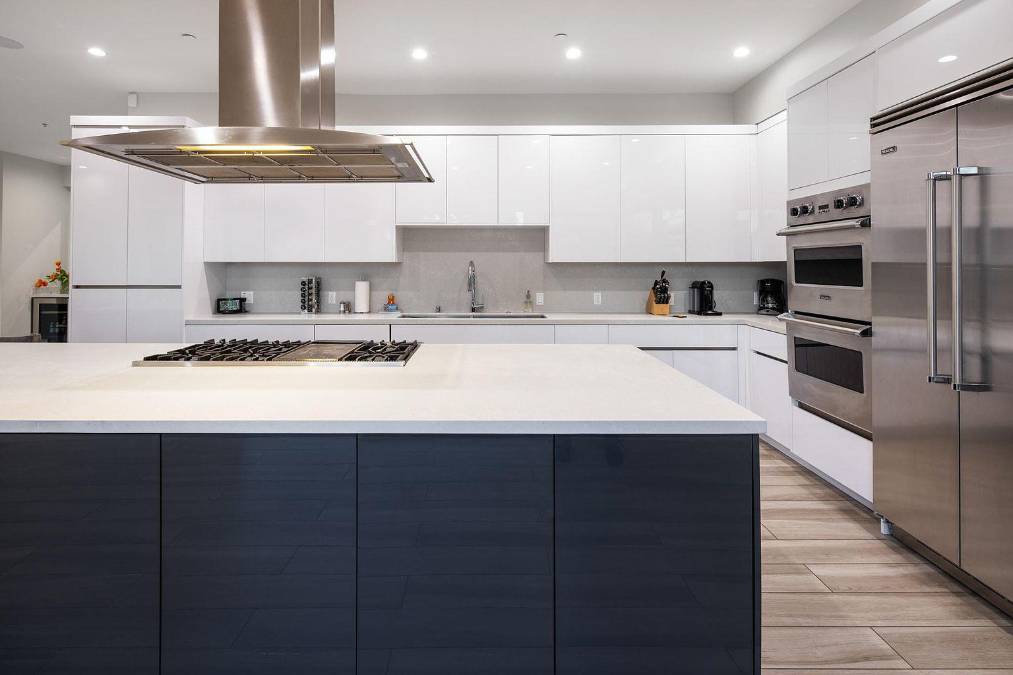 8 / 10La cocina de aspecto moderno no se aleja mucho de la estética. Cuenta con una larga isla, un televisor y una vista perfecta de la área verde del exterior.