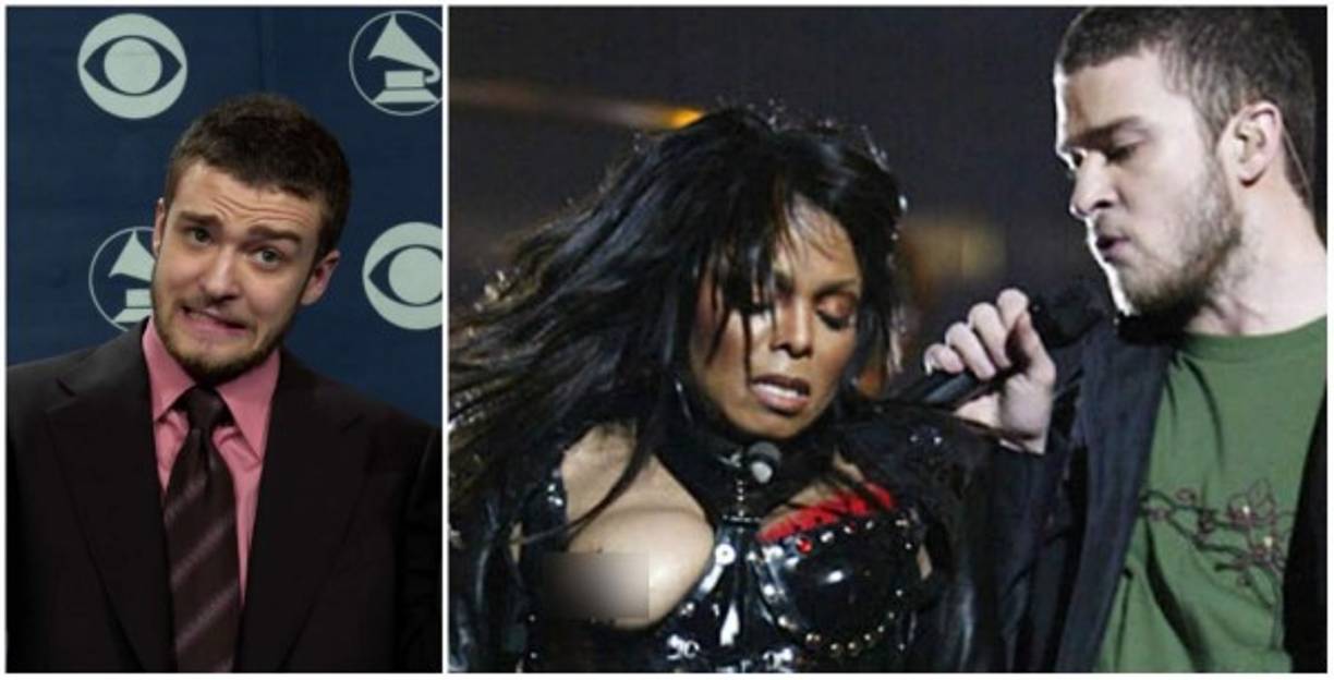 11 / 17En febrero de 2004, durante el show de medio tiempo de la transmisión del Super Bowl XXXVIII, Timberlake se presentó con Janet Jackson ante una audiencia de más de 140 millones de televidentes. Al final de la presentación Timberlake arrancó una parte del traje Jackson destinada a acompañar una parte de las letras de las canciones, pero terminó revelando el seno de la cantate. El representante de Jackson explicó que Timberlake pretendía 'quitar el bustier de goma para revelar un sujetador de encaje rojo'. -