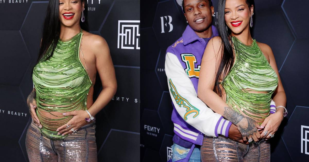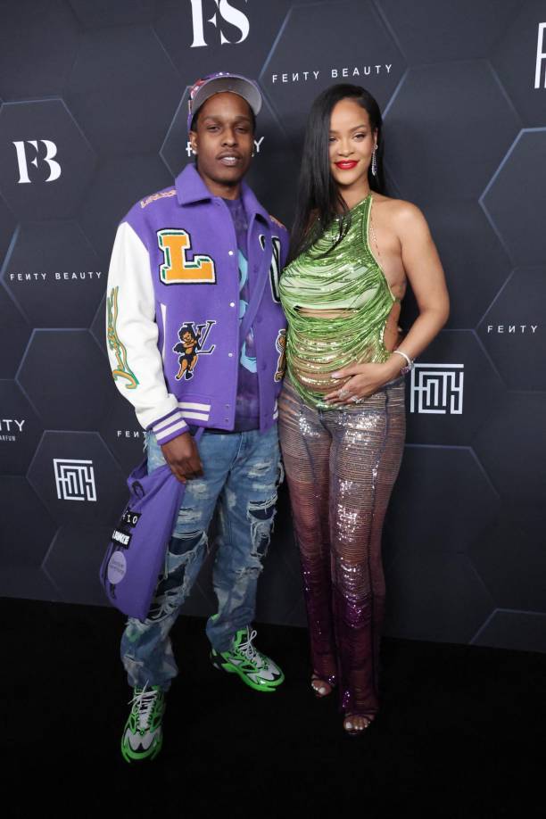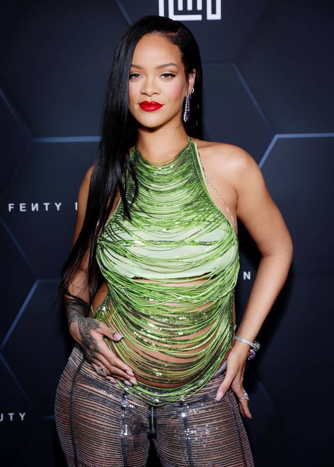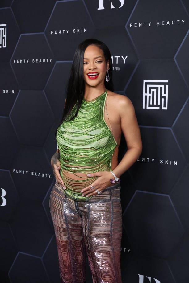 1 / 16La cantante Rihanna asistió anoche al evento de su marca de cosméticos, Fenty Beauty. La estrella nacida en Barbados desfiló por la alfombra roja acompañada de su pareja, el rapero A$AP Rocky. Rihanna lució un hermoso conjunto de lentejuelas en tonalidad verde y purpura que dejaba ver su pancita. -