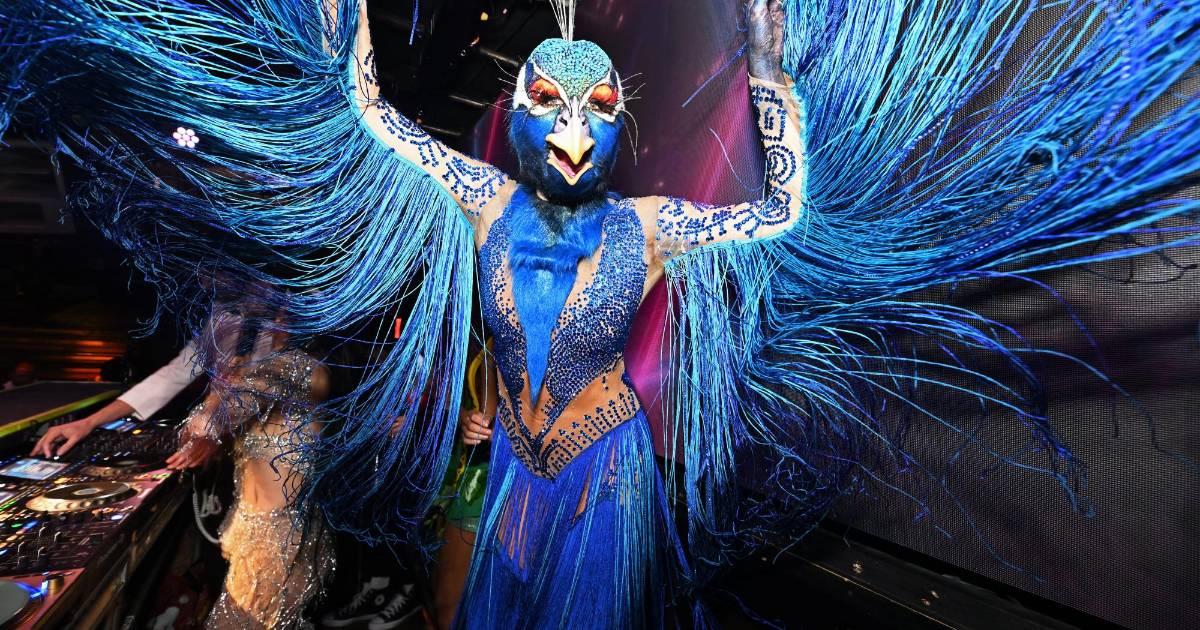 3 / 11A su llegada a la fiesta, Heidi Klum se subió sobre las piernas de uno de los bailarines para que el cuerpo del pavo pareciera aún más alto y estilizado, mientras todos movían las plumas.