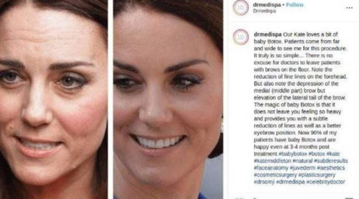 6 / 16El médico escribió en su cuenta: 'Nuestra Kate ama un poco el baby botox' junto a dos fotos de la duquesa de 37 años. En la imagen del 'antes', se la ve cansada y tiene arrugas. En el 'después' aparece impecable y radiante. -