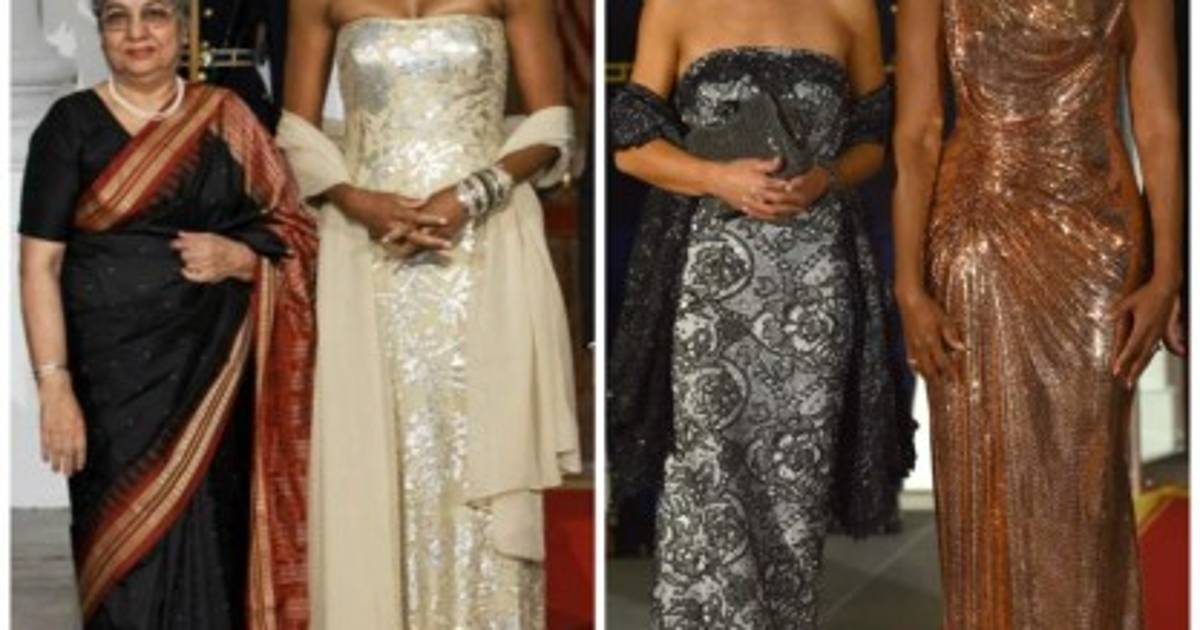 2 / 14En la cena en honor a India que se celebró en 2009, Michelle Obama lució un vestido palabra de honor firmado por Naeem Khan, uno de sus diseñadores favoritos. Khan es conocido por sus elaborados conjuntos y complejos bordados que también han conquistado a Kate Middleton y a la Reina Noor de Jordania. -