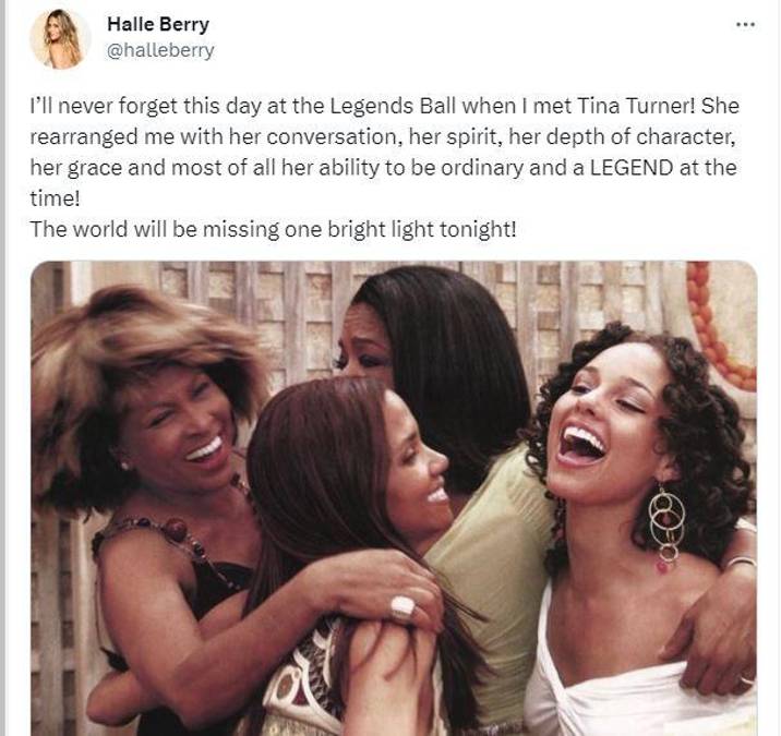 13 / 16La actriz Halle Berry dedicó un tweet a la famosa cantante donde la llama una leyenda y asegura que al mundo le faltará una luz brillante esta noche, lamentando su repentina muerte. “¡Nunca olvidaré este día en el Baile de Leyendas cuando conocí a Tina Turner! ¡Me reorganizó con su conversación, su espíritu, su profundidad de carácter, su gracia y, sobre todo, su capacidad para ser ordinaria y una LEYENDA en ese momento! ¡Al mundo le faltará una luz brillante esta noche!”, escribió.