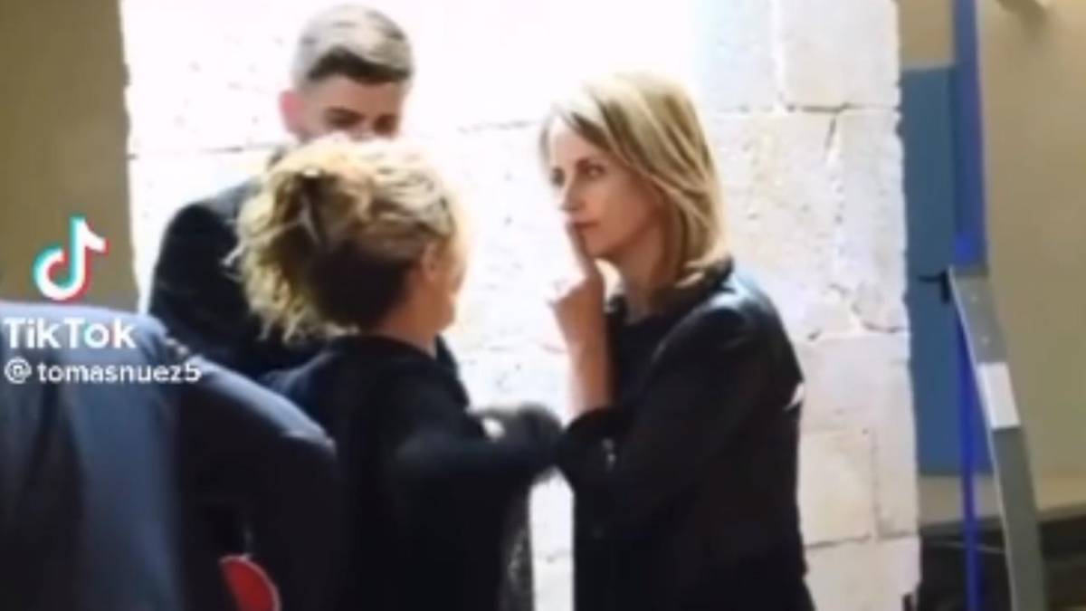 8 / 14En el clip la artista está de espaldas junto al padre de sus hijos mientras Bernabéu le agarra la mandíbula y con el dedo le hace la seña para que mantenga la boca cerrada.
