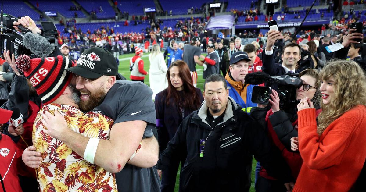 8 / 11BALTIMORE, MARYLAND - JANUARY 28: A detailed view of Taylor Swift's hand as she hugs Travis Kelce #87 of the Kansas City Chiefs after a 17-10 victory against the Baltimore Ravens in the AFC Championship Game at M&T Bank Stadium on January 28, 2024 in Baltimore, Maryland. Rob Carr/Getty Images/AFP (Photo by Rob Carr / GETTY IMAGES NORTH AMERICA / Getty Images via AFP)