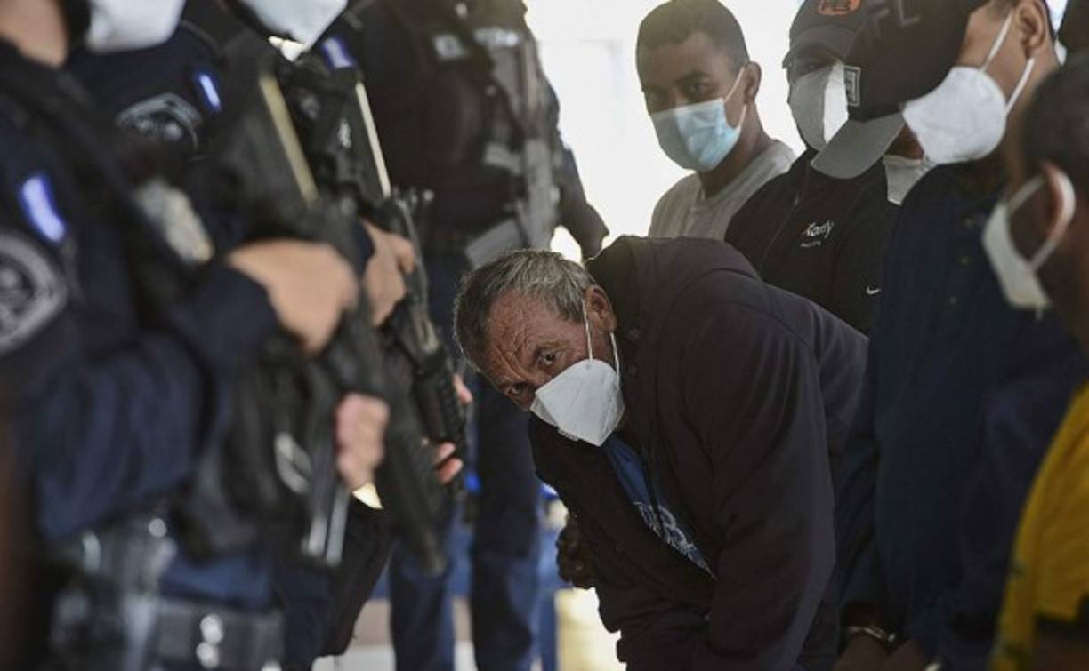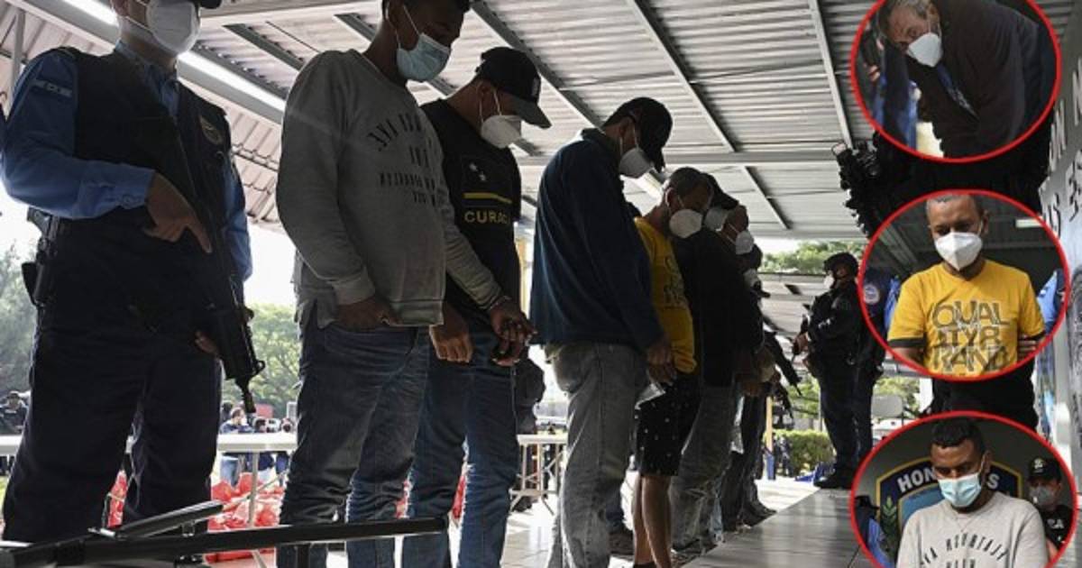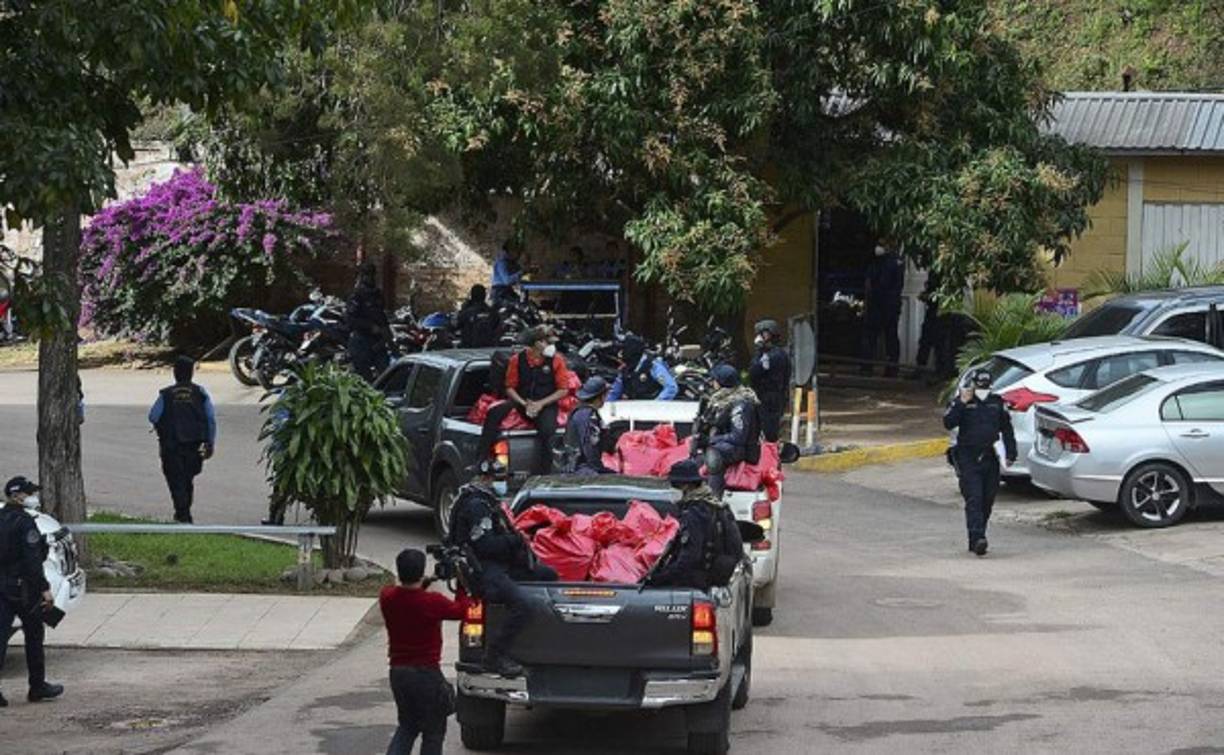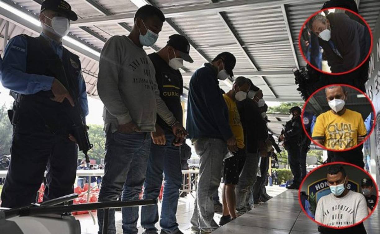 1 / 9Agentes de la Policía Nacional custodian a siete presuntos narcotraficantes durante en Tegucigalpa. Foto AFP -