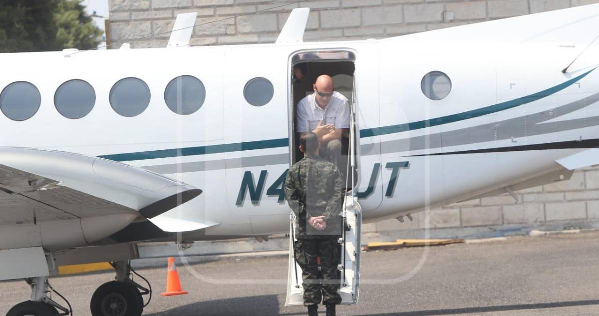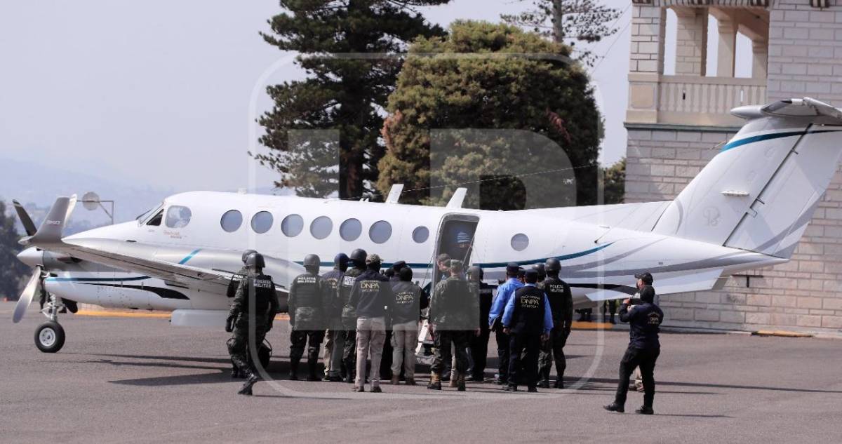 5 / 14Un Beechcraft de doble turbohélice de la agencia antidrogas estadounidense despegó desde una base de la Fuerza Aérea Hondureña a las 14H27 locales (20H27 GMT) con Juan Orlando Hernández a bordo, esposado y custodiado.