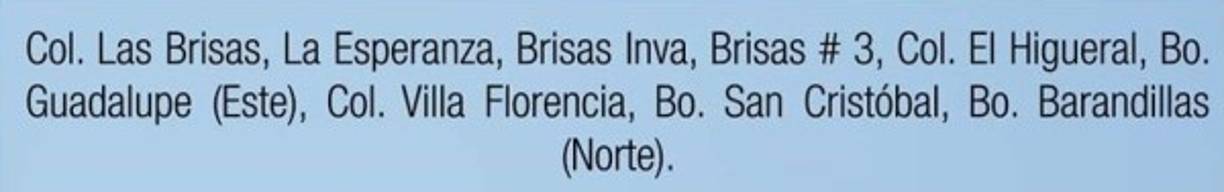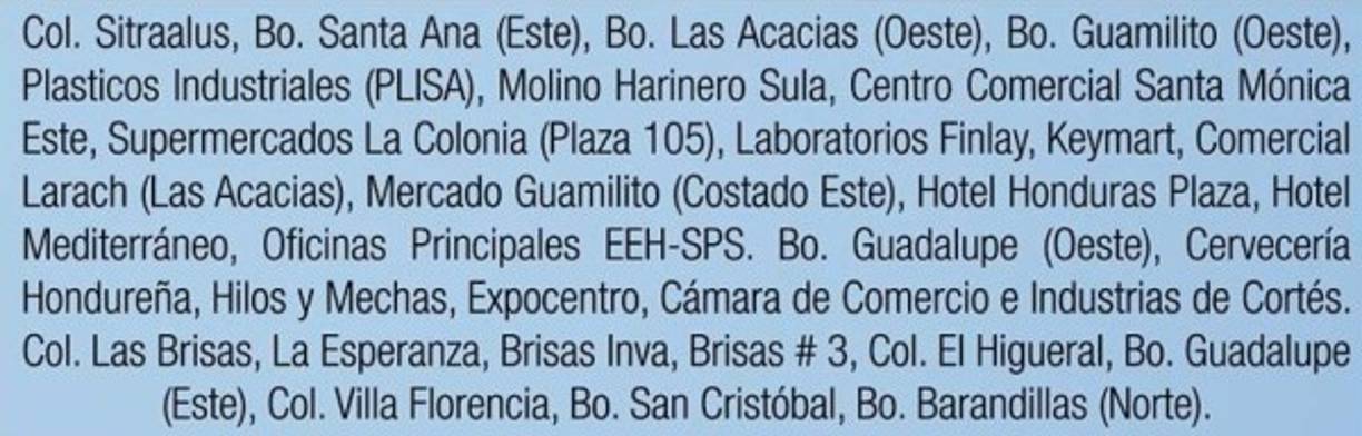 3 / 9En San Pedro Sula, de 8:30 am a 4:00 pm, por mantenimiento en la línea y habilitación de enlaces para transferencias de carga entre los circuitos 208, 288 y 247, estarán sin servicio los siguientes sectores: -