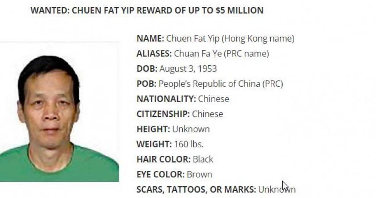 13 / 13CHUEN YIP: Capo chino, cuya última dirección conocida fue en Wuhan. Es buscado por varias violaciones federales, incluyendo narcotráfico. La DEA ofrece 5 millones de dólares por toda información que ayude a arrestar al hombre de 69 años de edad.