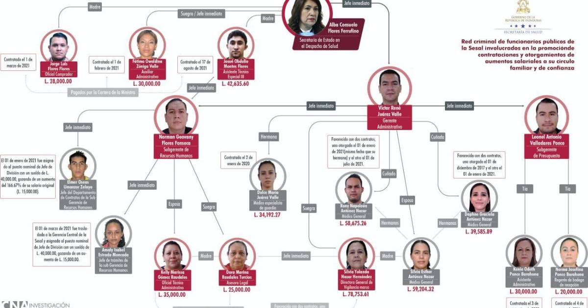 Según el CNA, esta red de corrupción ha venido operando sin escrúpulos entre los años 2020 y 2021 mediante el otorgamiento de contratos, plazas y aumentos desproporcionados de salario en favor de familiares y sujetos cercanos a la ministra de Salud Alba Consuelo Flores.