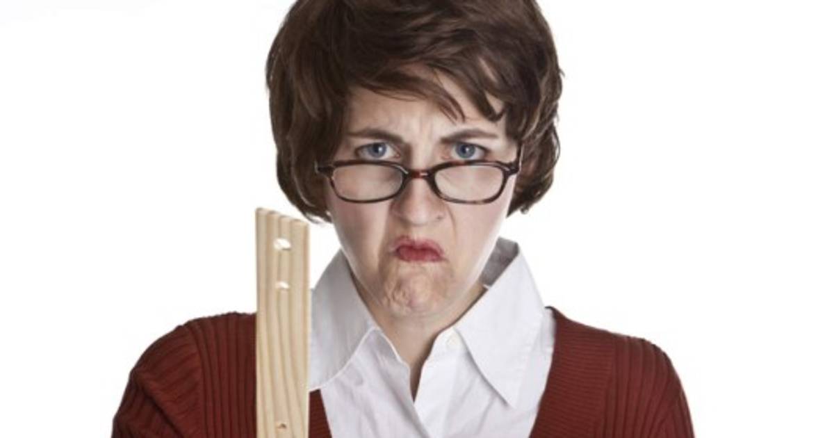 1 / 16An angry teacher holding a composition book and pointing a ruler. -