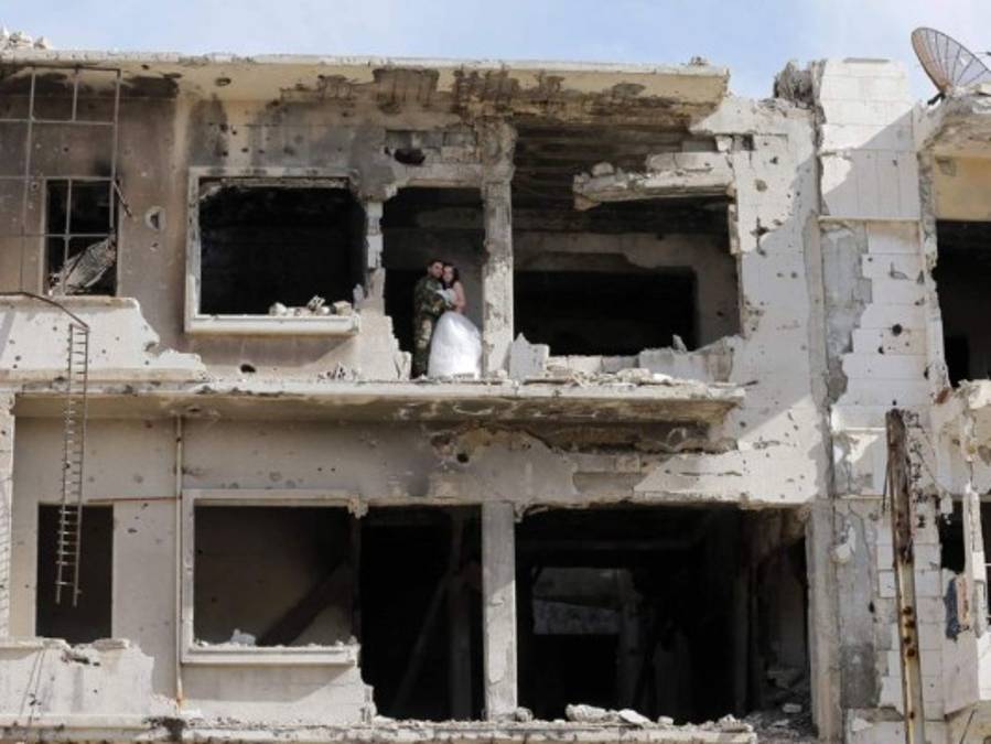 1 / 8Una joven pareja conformada por un soldado del ejército sirio de Bachar al Assad y su novia, decidieron realizar las fotografías de su boda en los escombros de la ciudad siria de Homs. Fotos AFP. -