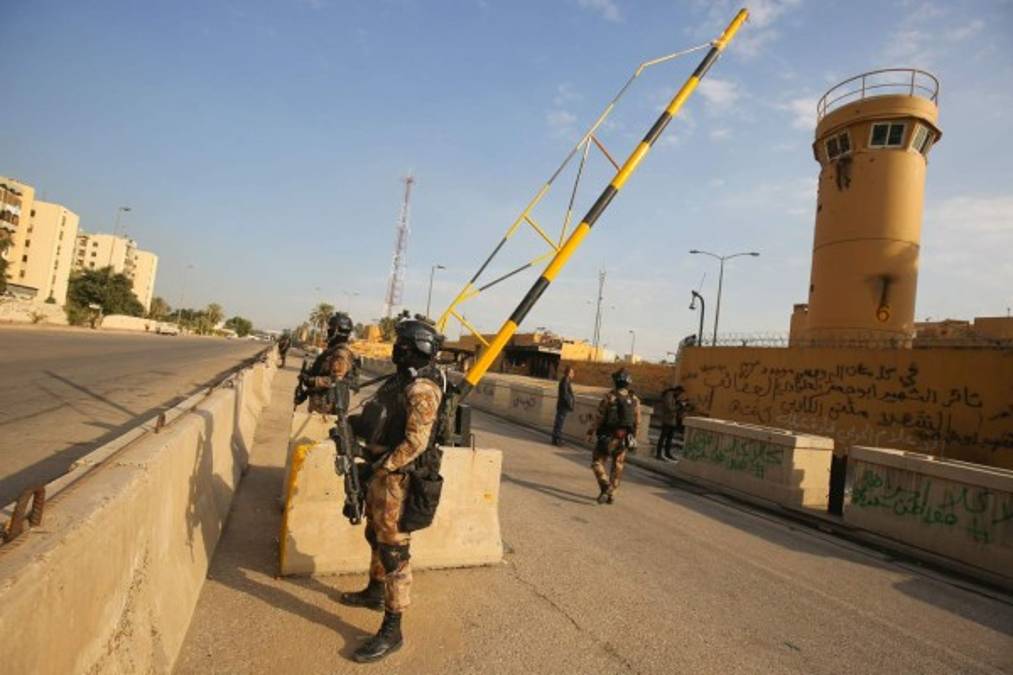 4 / 13Un gran número de miembros de las fuerzas de seguridad iraquíes encargadas de proteger la Zona Verde, donde se ubican embajadas y edificios gubernamentales, permanecen desplegadas alrededor de la Embajada estadounidense. -