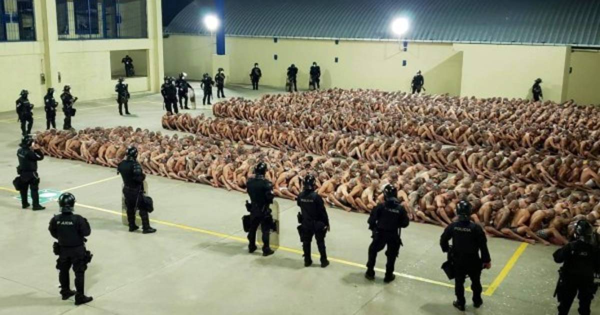 5 / 13La presidencia de El Salvador divulgó imágenes de los reos semidesnudos y con mascarillas en los patios de la prisión mientras se realizaban requisas en las celdas. -
