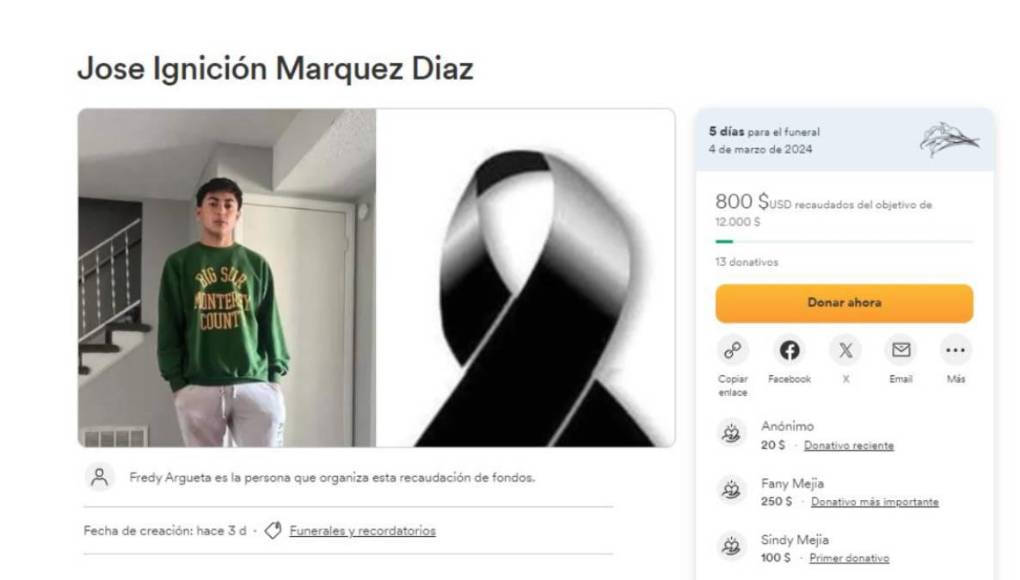 10 / 10Tambin han pedido ayuda en Gofundme. “Hola me llamo Fredy, por este medio estoy tratando de apoyar con la autorizacion de su familia a recaudar fondos de mi amigo José Marquez, (Nachito como muchos lo conocíamos, para repatriar su cuerpo y que pueda tener una despedida digna cerca de su familia en el país de Honduras, como muchos sabemos los costos fúnebres y de repatriacion son muy caros, el perdió su vida la madrugada de el sábado de una manera trágica, el radicaba en la ciudad de Raleigh Carolina del Norte, los que puedan aportar con un granito de arena a esta causa... estaremos muy agradecidos”, explica el escrito.