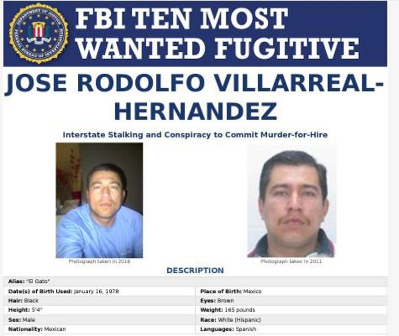 6 / 10El mexicano José Rodolfo Villarreal Hernández es buscado por ordenar a personas que rastrearan y asesinaran a un hombre en Southlake, Texas, en mayo de 2013. Se ofrece una recompensa de hasta $1,000,000 por información que conduzca a su captura.