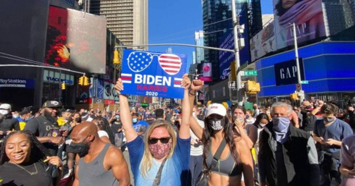 10 / 19En el céntrico Times Square, centenares de personas se concentraron para gritar y celebrar la victoria de Biden con la proyección de que ganará los 20 votos del Colegio Electoral del estado Pensilvania. -
