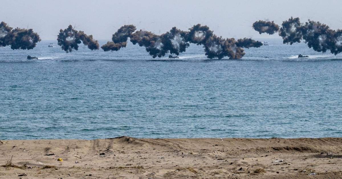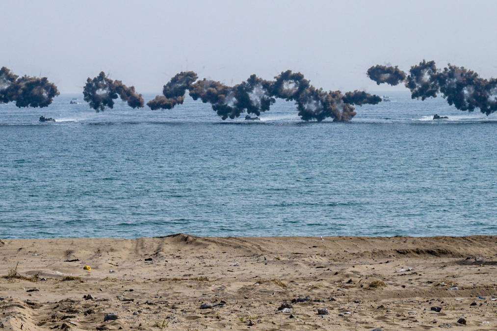 7 / 13Después, los vehículos anfibios surcoreanos KAAV, desplegados desde el buque de asalto anfibio Dokdo (14.300 toneladas), arribaron a la orilla en tres oleadas y de ellos desembarcaron decenas de marines.