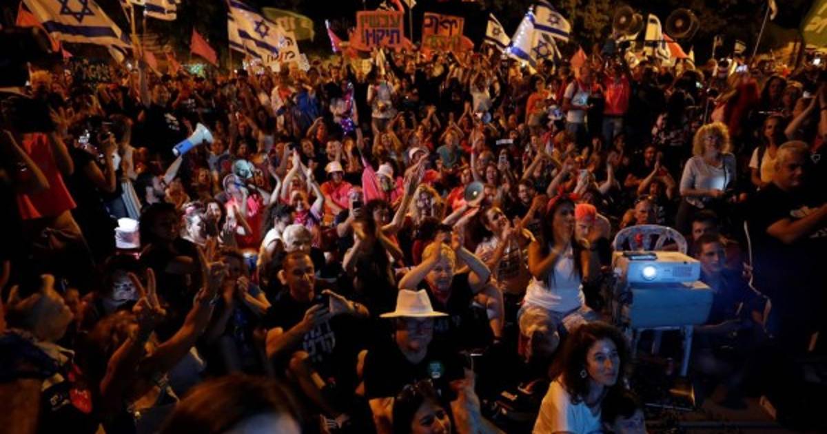 3 / 8Desde hace cerca de un año, los israelíes se manifiestan frente a la residencia oficial del primer ministro, en el centro de Jerusalén, para reclamar la salida de Netanyahu, juzgado por corrupción, malversación y abuso de poder en una serie de casos. -