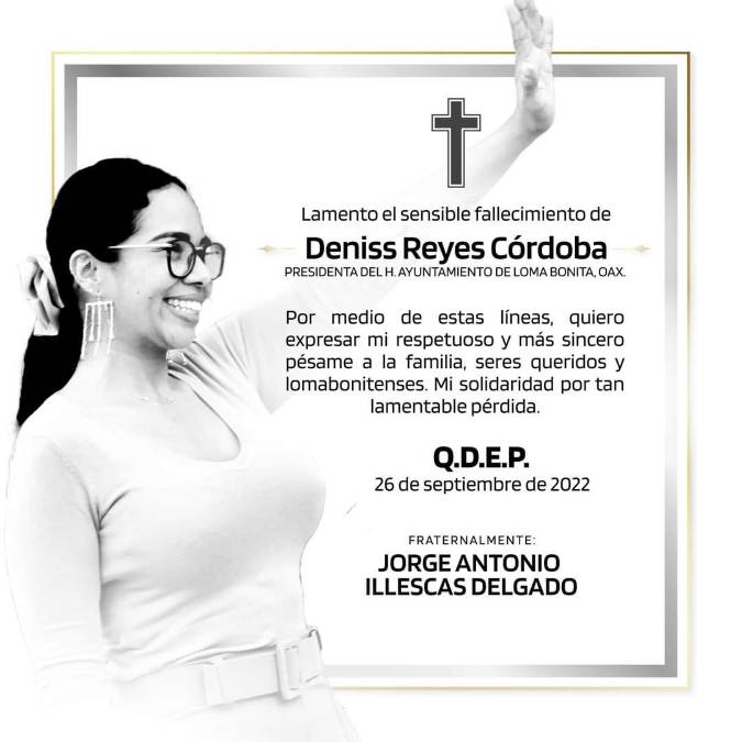 4 / 10A su vez, Alejandro Murat Hinojosa, gobernador de Oaxaca, también se pronunció por la muerte de la edil y expresó sus condolencias a sus familiares y amigos. “Lamento el sensible fallecimiento de Denisse Reyes Córdoba, quien fuera presidenta municipal de Loma Bonita; un abrazo a sus familiares y seres queridos”, escribió el mandatario.