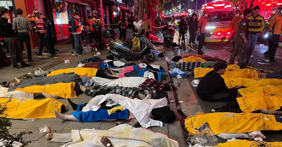 9 / 17Los cuerpos de las víctimas, que se cree que sufrieron un paro cardíaco, están cubiertos con mantas en el popular distrito de vida nocturna de Itaewon en Seúl .
