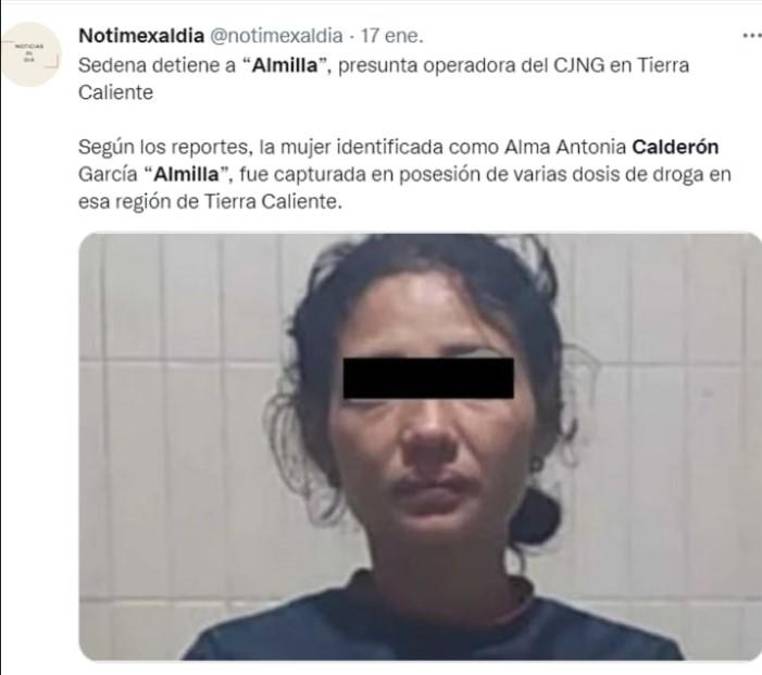 7 / 10También personal del Ejército Mexicano y de la Guardia Civil, detuvo a una persona con varias dosis de droga en el municipio de Aguililla. La mujer fue identificada como Alma Antonia Calderón García “Almilla”, operadora en diferentes actividades del CJNG en esa región de la Tierra Caliente.