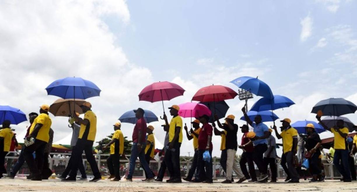9 / 16Manifestantes se protegen del fuerte sol africano durante una marcha en Lagos, Nigeria. -