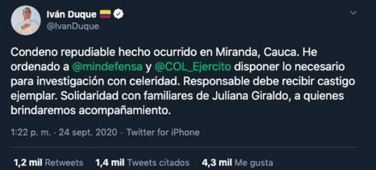 8 / 12Mientras que el presidente Iván Duque condenó lo ocurrido y lo calificó como un 'repudiable hecho', varios sectores le exigieron pronunciamientos contundentes y medidas que ayuden a Colombia a salir de la espiral de violencia que sigue en aumento. -