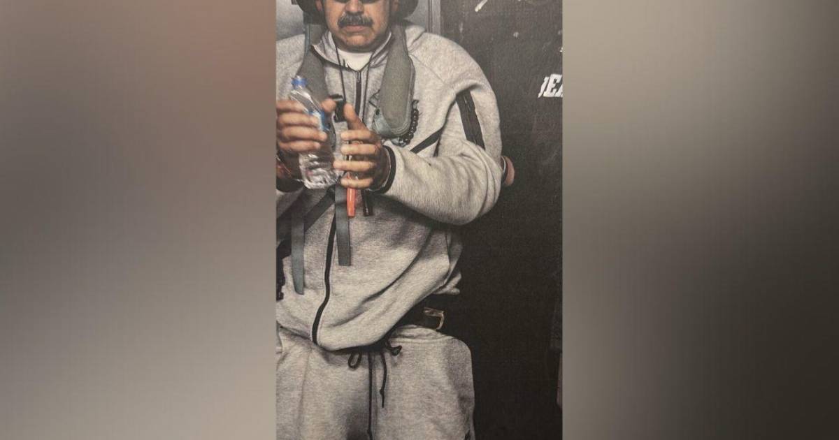 "Nicolás Maduro a bordo del USS Iwo Jima", escribió Trump en su red Truth Social junto a la imagen, en la que que Maduro aparece de pie, vestido con un chándal gris de la marca deportiva Nike, una especie de antifaz sobre los ojos y canceladores de sonido sobre los oídos, mientras sostiene una botella de agua con sus manos esposadas.
