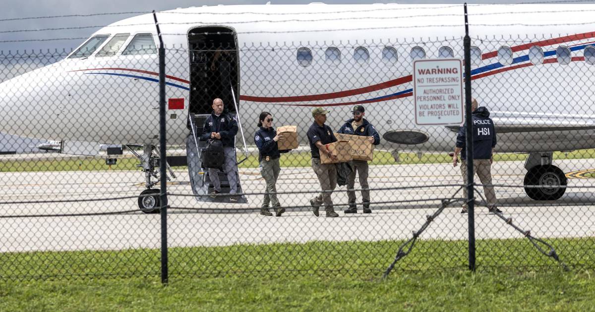 3 / 13Oficiales extraen cajas etiquetadas como evidencia del avión que, según las autoridades, pertenece al presidente venezolano Nicolás Maduro en el Aeropuerto Ejecutivo de Fort Lauderdale, Florida.