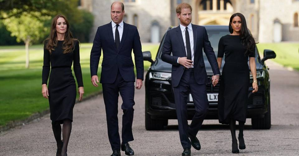 2 / 14Vestidos de riguroso luto, los nuevos príncipes de Gales, William y Kate, y los duques de Sussex, Harry y Meghan, miraron las flores, las tarjetas y dibujos de niños depositados ante el castillo de Windsor, antes de acercarse a los súbditos allí reunidos.