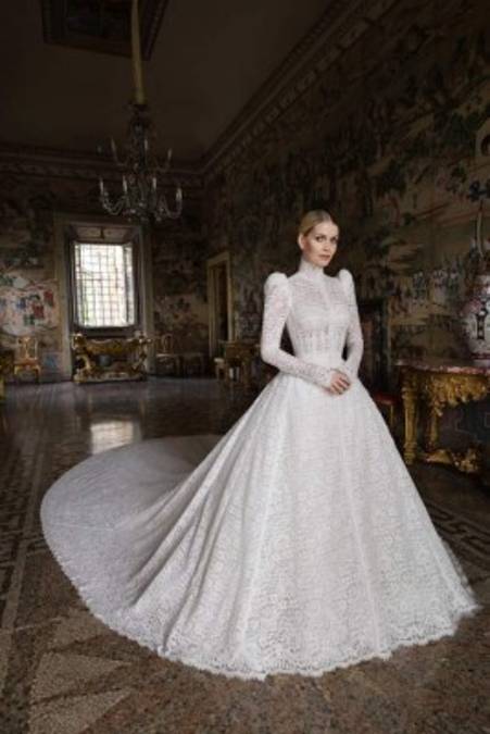 3 / 18Para esta importante ocasión, Domenico y Dolce le confeccionaron, durante 6 meses, un vestido a la media, sobrio y elegante, con cuello alto, mangas abullonadas y de inspiración victoriana realizado en finos encajes blancos. -