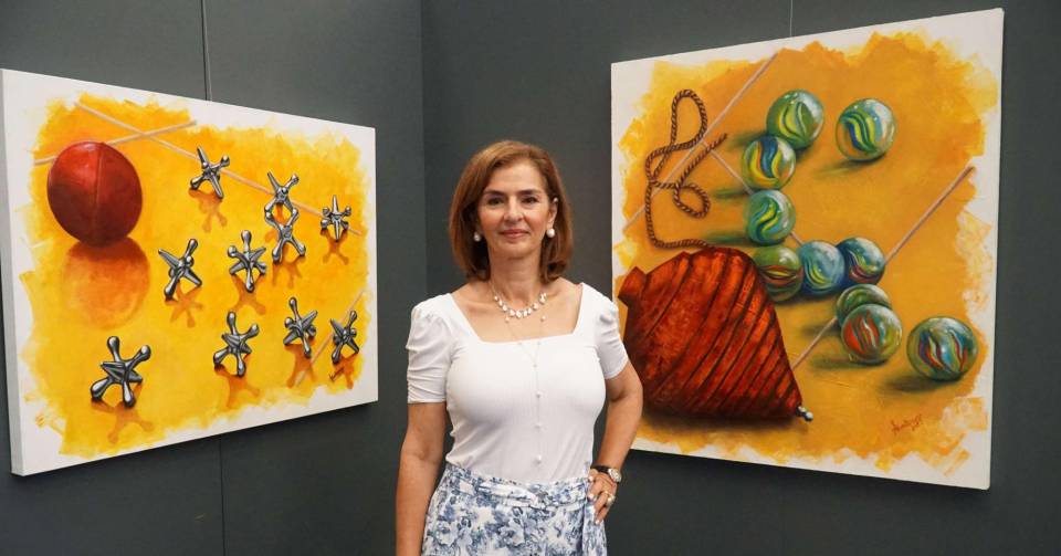 1 / 32Suyapa Monterroso junto a sus dos obras que aluden a los juegos típicos de antaño, el trompo, los “maules” y los “yaxes”.