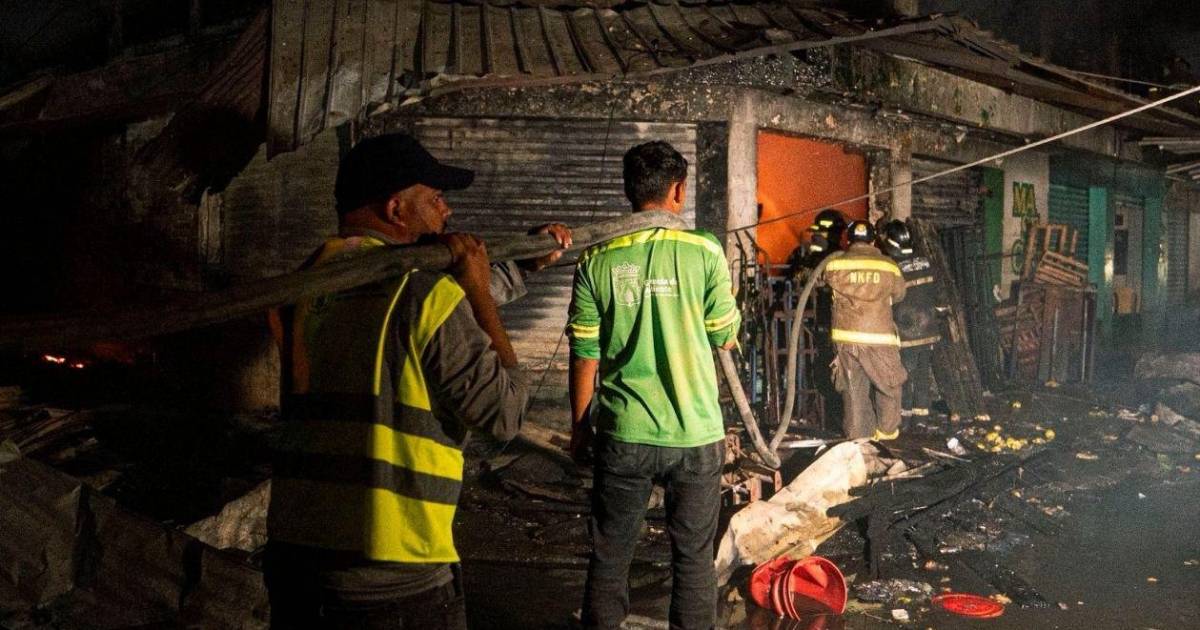 El fuego seguía anoche consumiendo puestos del mercado. En horas de la madrugada, los bomberos hacian labores de enfriamiento.