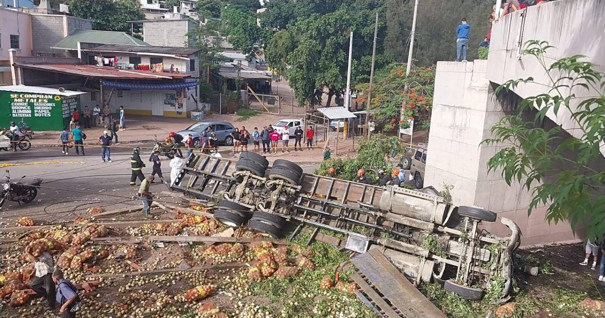 Imágenes: camión cargado de cebollas vuelca y conductor muere en Tegucigalpa