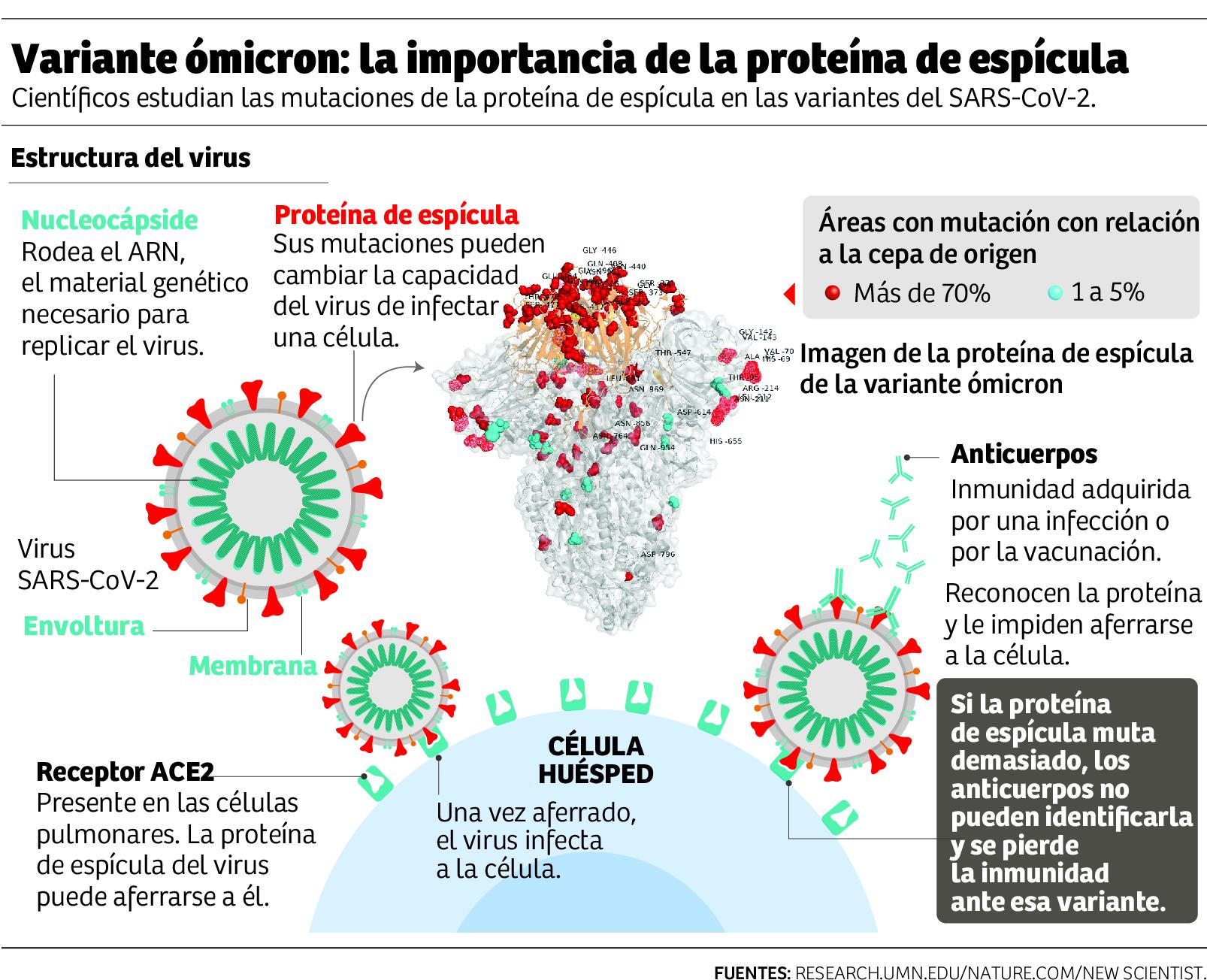 El hecho de tener tantas mutaciones provoca el temor de que la espiga o espícula de la variante ómicron pueda evadir en cierto modo los anticuerpos producidos por un contagio previo o por la vacunación.