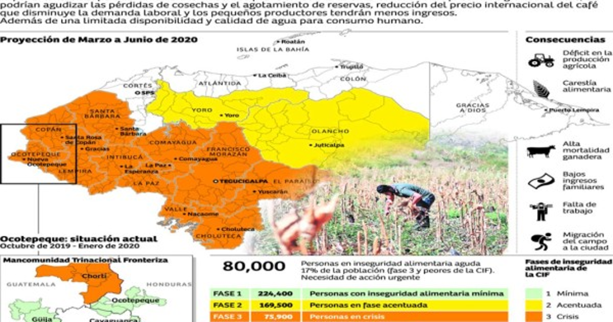Crisis y emergencia. Esa es la proyección que la Clasificación Integrada de las Fases de la Seguridad Alimentaria (CIF) realiza para Honduras, donde los departamentos de Choluteca con 164,000 personas, Comayagua con 135,000 y El Paraíso con 125,000 se verán afectados.