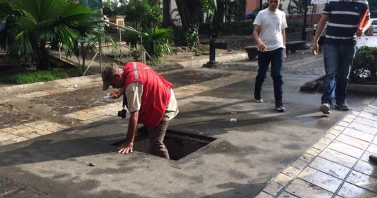 Varios sampedranos que transitan por el parque central han caído en una alcantarilla sin tapadera.