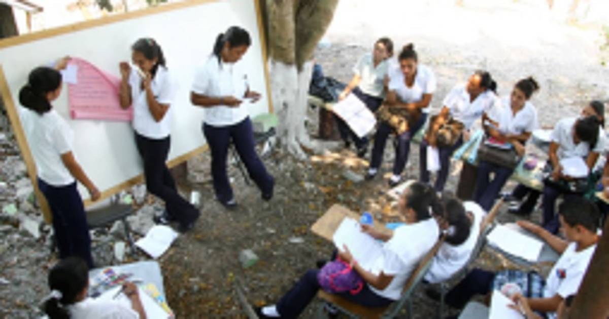 Para recibir sus clases, los alumnos sacan las sillas de una bodega y las acomodan, no en un piso de losa sino sobre la tierra; es hora de sentarse, como lo han hecho durante los últimos 53 días, debajo de los árboles.