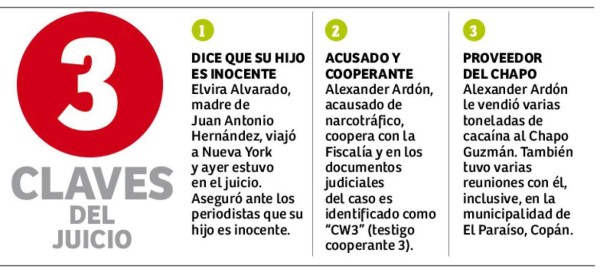 El excapo del narcotráfico y exalcalde hondureño Alexander Ardón relató ayer en una corte de Nueva York que presenció una reunión en 2013 en la cual el Chapo Guzmán entregó un millón de dólares en efectivo al exdiputado Juan Antonio Hernández, acusado de narcotráfico en Estados Unidos, para la campaña de su hermano Juan Orlando Hernández, actual presidente de Honduras.